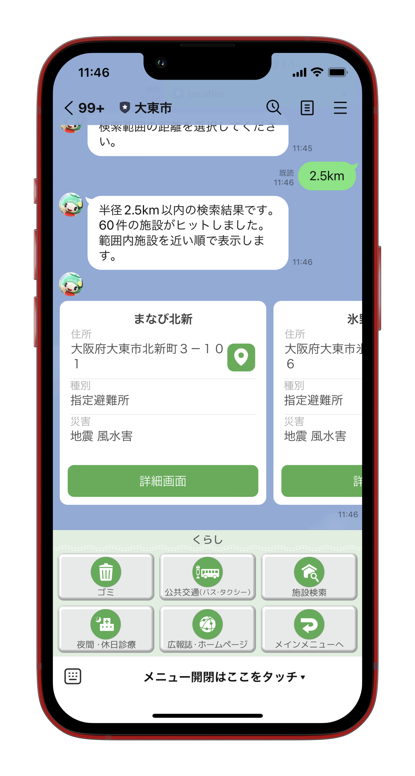 - トーク画面の下の方に選択肢が表示されますので、検索したい施設のカテゴリを選択してください。