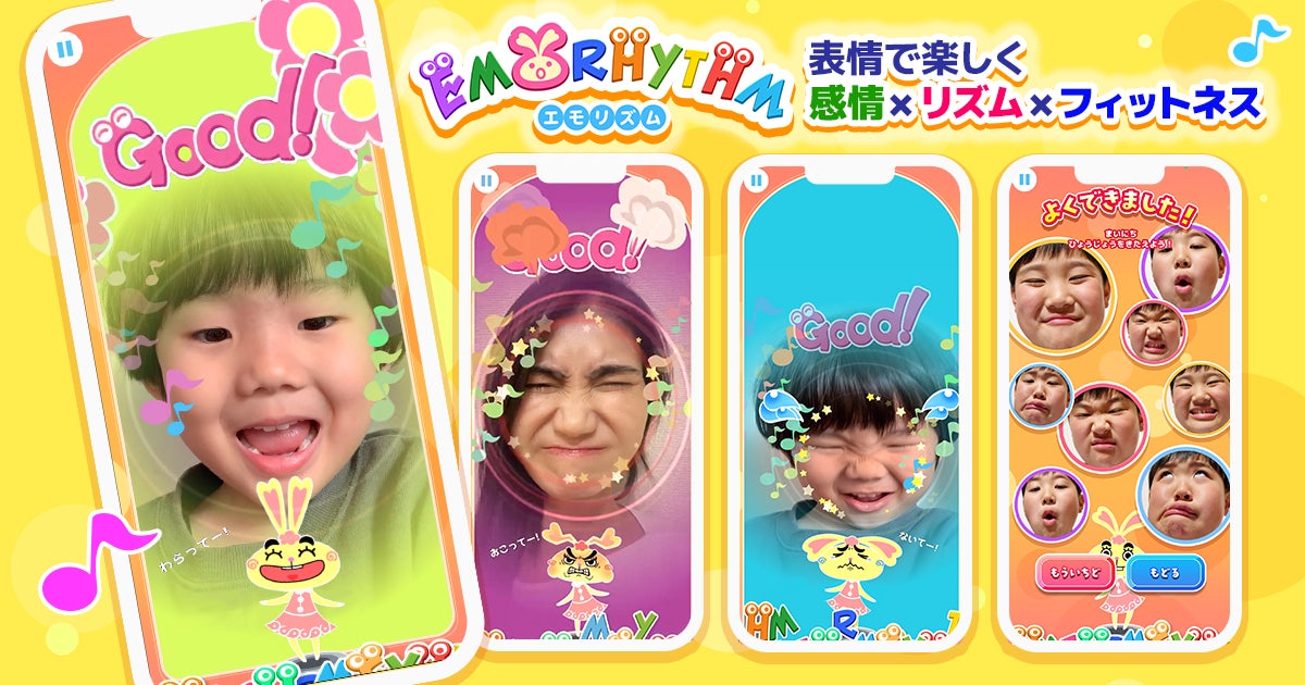 「エモリズム」は、小さな子や恥ずかしがり屋の人でものびのびと表情遊びが楽しめるように、“子ども番組”をモチーフにしています。テレビの中から子どもたちに呼びかけるように、ウサギのキャラクターがリズミカルに「笑って~!」とお題を出します。