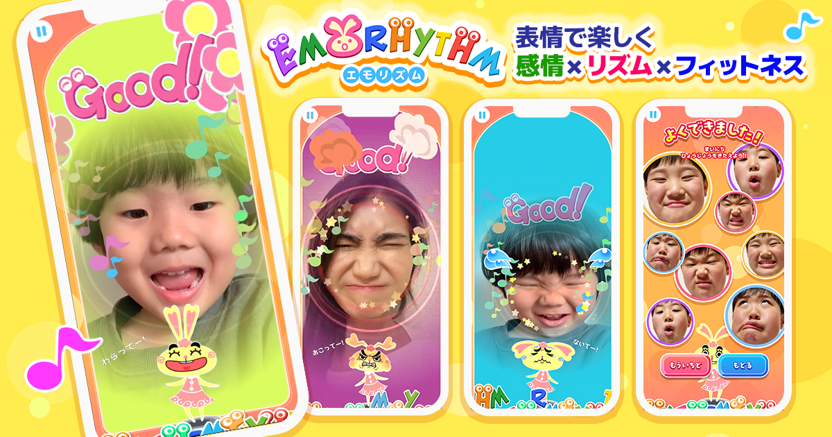 「エモリズム」は、小さな子や恥ずかしがり屋の人でものびのびと表情遊びが楽しめるように、“子ども番組”をモチーフにしています。テレビの中から子どもたちに呼びかけるように、ウサギのキャラクターがリズミカルに「笑って~!」とお題を出します。