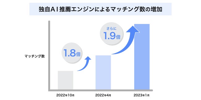 2022年4月時点において、従前と比較してマッチング数を最大約1.8倍の増加に成功していました。4月以降の継続的なアップデートによって、今回2022年4月時点の成果から、さらにマッチング数を最大1.9倍増加することに成功いたしました。