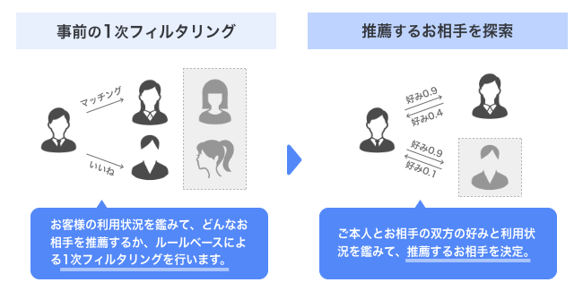 独自AI推薦エンジンでは第一に、事前の1次フィルタリングの条件をユーザーの利用状況に合わせて高度化いたしました。推薦の可能性は膨大な組み合わせが存在し、AIで全ての組み合わせをつぶさに探索することは計算時間の観点から困難となっておりました。そのため、事前に居住エリア等のプロフィール情報をもとに、ルールベースで推薦するお相手についてAIが探索する範囲を制限しておりました。そこで今回のアップデートにおいて、これまではお客様一律に設定されていたルールベースの条件を、お客様一人ひとりの利用状況に応じて動的にカスタマイズされるように改修いたしました。この改修によってお客様毎の好みの多様性に対して今まで以上にきめ細かく対処することが可能となりました。その結果として、マッチング数を増加させることに成功いたしました。