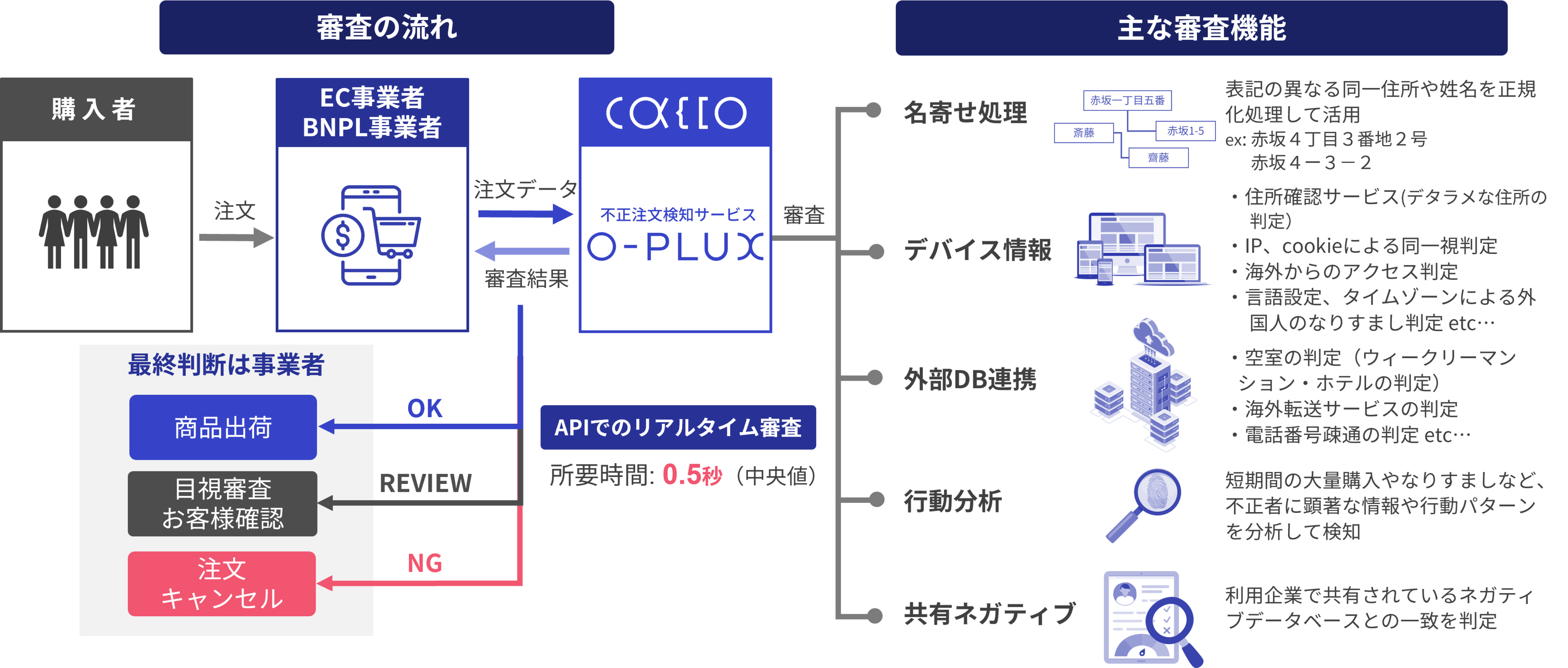 「O-PLUX」の利用企業でクレジットカード不正などのネガティブ情報を共有しているため、自分たちのデータだけでは知りえない不正を検知することが可能。