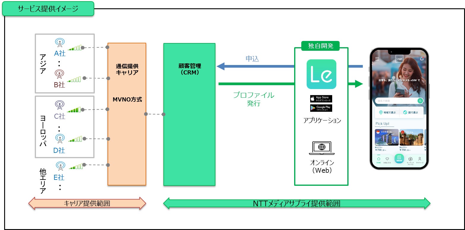 当初は、現地の通信事業者からSIM調達を行いお客さまに通信サービスを提供する「MVNO方式」により世界50カ国に対応、また当社webサイトとOTA(オンライン旅行代理店)を通じてのトライアル提供となります。