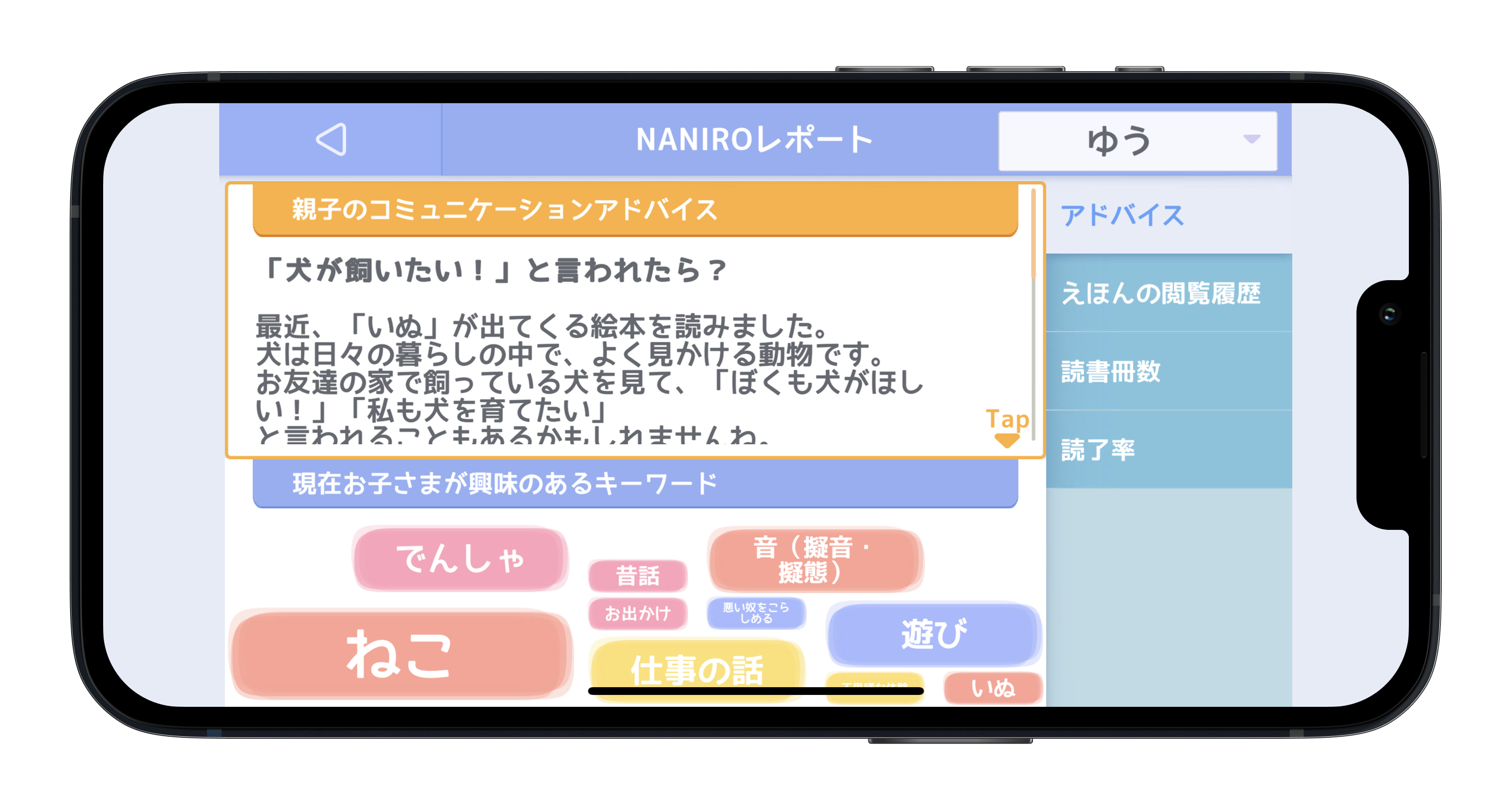 子どもは気に入った絵本があれば繰り返し読むため、NANIROではその興味関心の蓄積をデータ化し分析・レポートします。多忙な現代のママ・パパが、親子のコミュニケーションや子どもについての夫婦の会話に活用することができます。きょうだいがいる場合も設定により子どもごとのレポートを出すことが可能です。