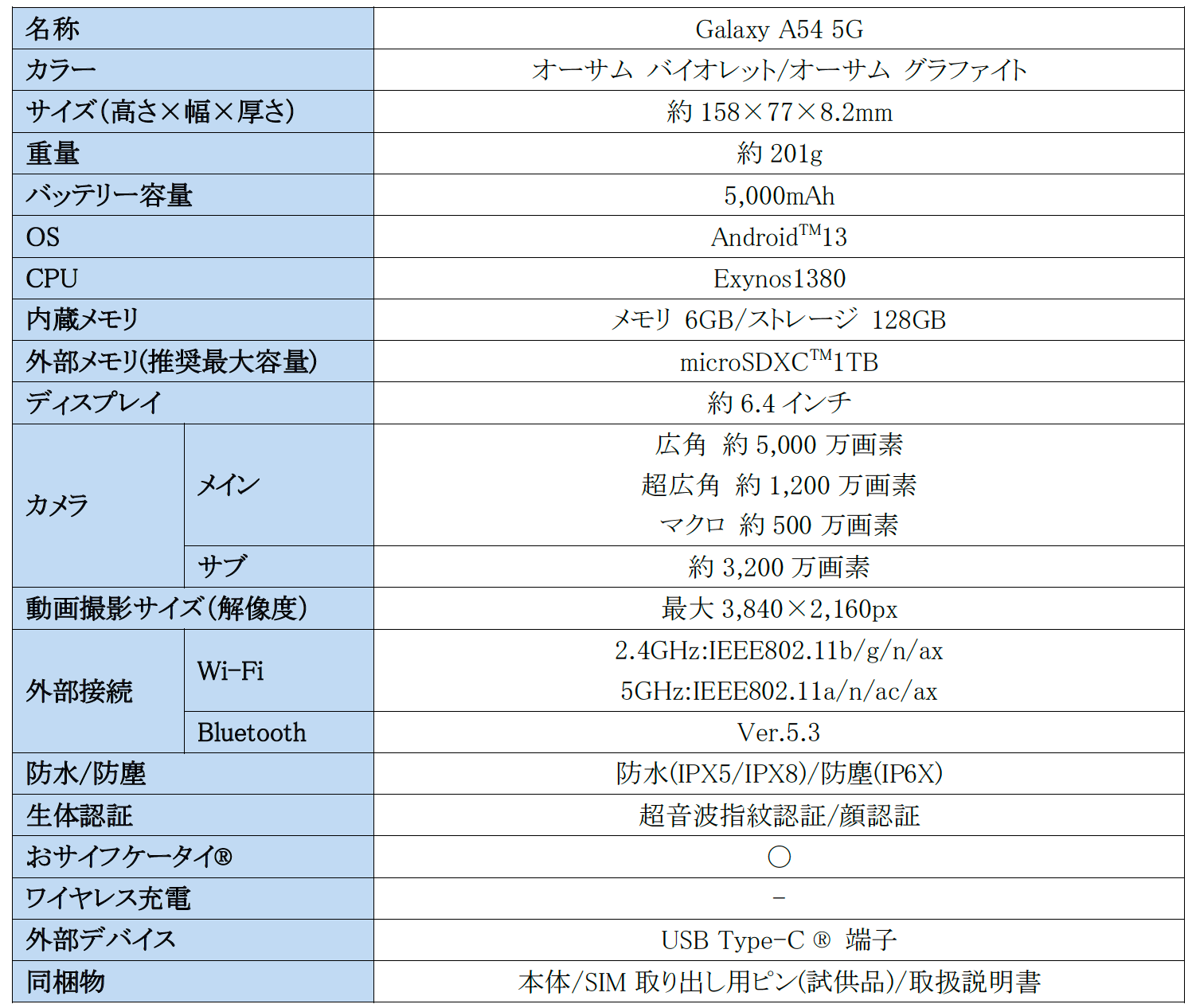 〈主な仕様:「Galaxy A54 5G」〉