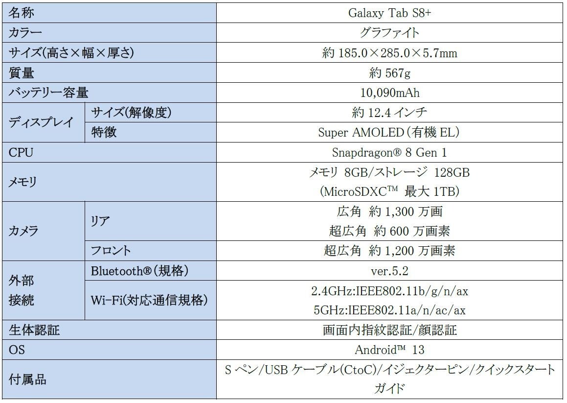 <主な仕様:「Galaxy Tab S8+」>