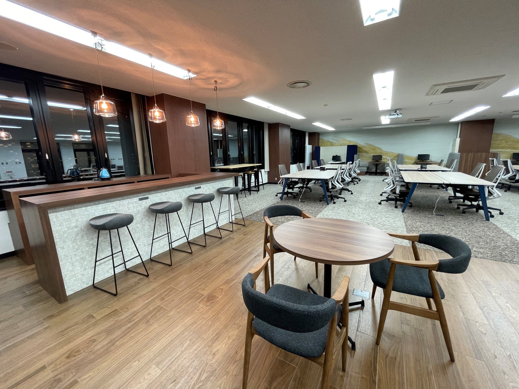 カフェエリアとバーカウンターの床面は落ち着きのある木目素材を採用し、仕切りを作らずシームレスなオフィスとすることで、全体をイベントスペースとして利用することも可能です。大型スクリーンとプロジェクターも常備しています。