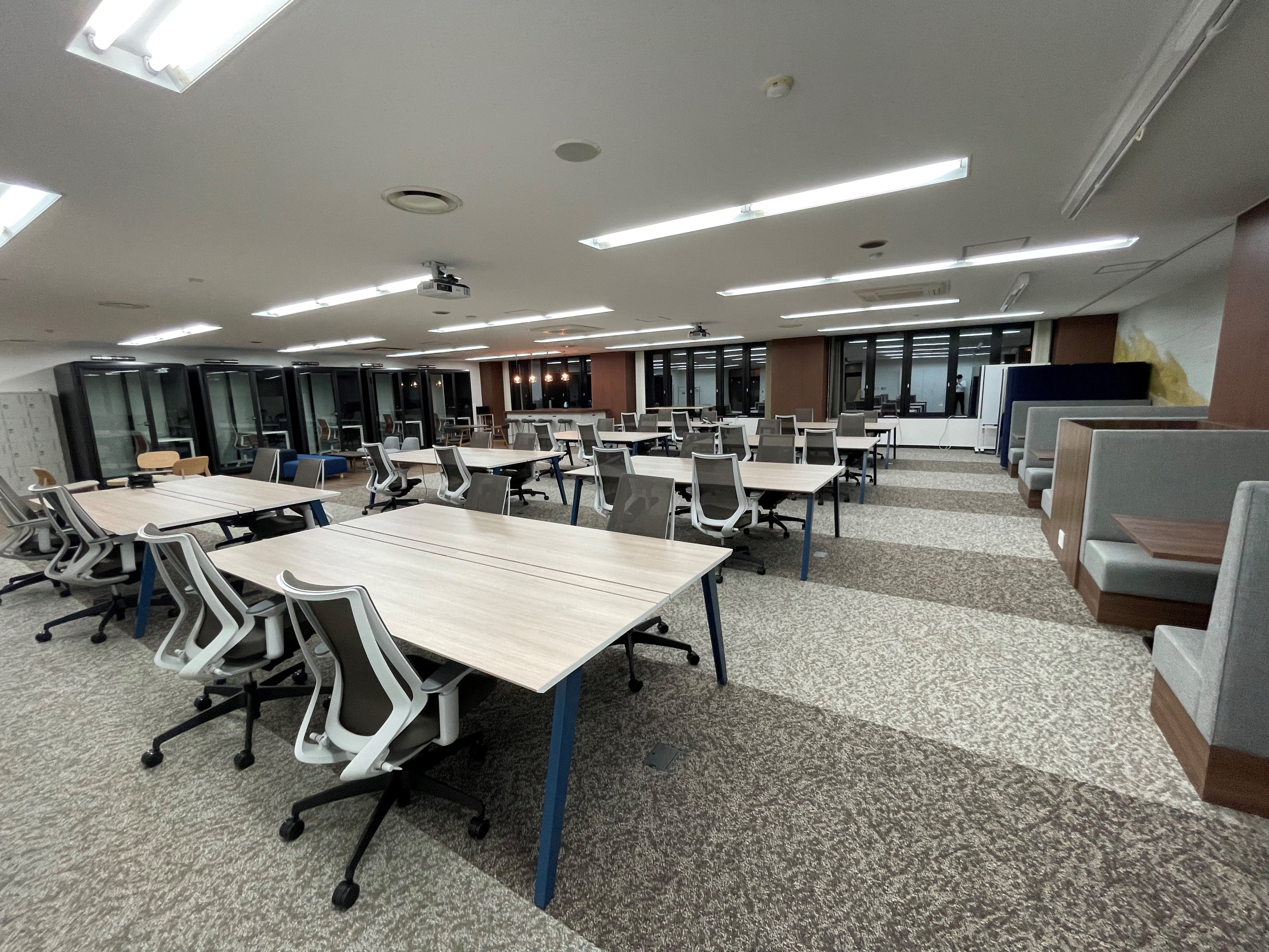カフェエリアとバーカウンターの床面は落ち着きのある木目素材を採用し、仕切りを作らずシームレスなオフィスとすることで、全体をイベントスペースとして利用することも可能です。大型スクリーンとプロジェクターも常備しています。