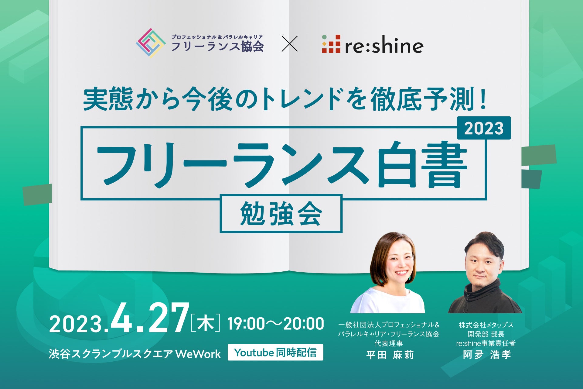 2023年3月28日に公開された最新版の「フリーランス白書2023」は、「フリーランス実態調査」、「フリーランス・副業人材の仲介事業者実態調査」の二本立ての内容となっており、フリーランス協会の代表理事の平田麻莉さんと、弊社が運営するフリーランスの為のマッチングサービス「re:shine」の事業責任者の阿夛が「フリーランス白書2023」から見える今後のトレンドを予測し、参加者のみなさんと一緒に勉強・交流する会を実施いたします。フリーランスのリアルな実態、仕事獲得経路、発注者との関係性や裏話なども聞ける機会となっております。