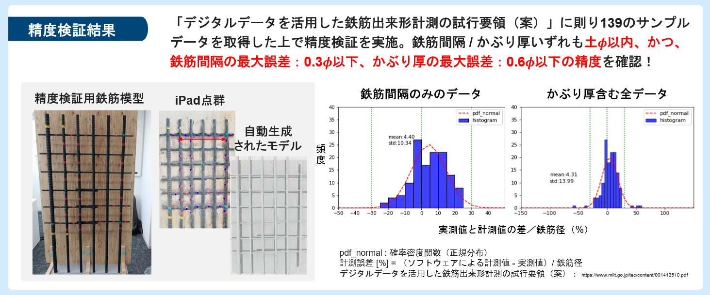また、3次元データの特性を生かして「かぶり厚」や円形フープ筋、円形配筋などの点検項目にも対応可能です。「デジタルデータを活用した鉄筋出来形計測の試行要領(案)」に則り139のサンプルデータを取得したうえで精度検証を実施したところ、鉄筋間隔/かぶり厚いずれも±100%以内かつ、鉄筋間隔の最大誤差0.3φ以下、かぶり厚の最大誤差0.6φ以下と高い精度が確認されています。