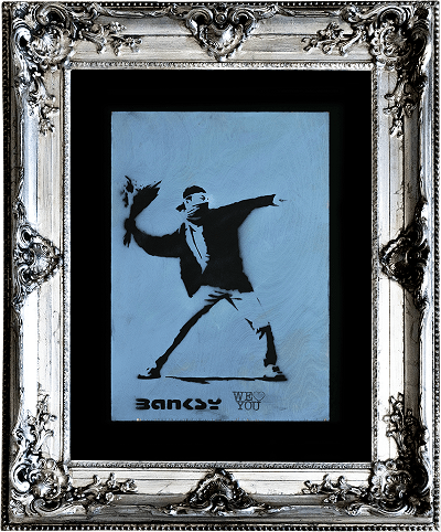 本美術館で展示している「Love Is In The Air」は、イギリスのマンチェスター市立美術館で10年以上にわたって公開展示されていた重要作品で、バンクシー自身によって木製の板にスプレーペイントされた世界に1点しか存在しない作品です。「Love Is In The Air」といえば、パレスチナ・ベツレヘムに制作された巨大壁画が有名ですが、本作品はこの巨大壁画よりも制作年代が早く、花束を投げるテロリストのモチーフの起源となる最初期の作品とされています。