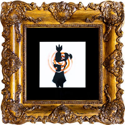 本美術館で展示している「Bomb Love Over Radar」は、「Bomb Love」という作品に赤いレーダーマークが加わった、バンクシー自身によってスプレーでキャンバスに描かれた世界に一点のみの希少性の高い作品です。バンクシーからコレクターに直接プレゼントされて以降、長らく秘蔵となっていた作品で、世界初公開・初展示となります。