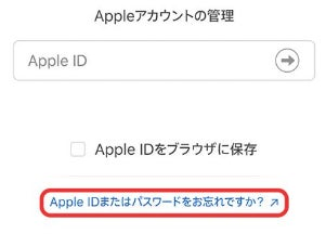Step1:ブラウザからAppleアカウントの管理ページを開き、「Apple IDまたはパスワードをお忘れですか?」をタップします。
