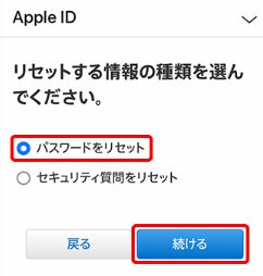 Step3:パスワードをリセットにチェックを入れて「続ける」を選択します。