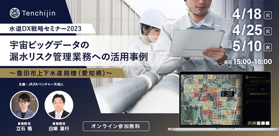 自治体関係者様限定で「天地人コンパス 宇宙水道局」の導入説明会を開催します。セミナーでは、本システムの機能の紹介に加え、愛知県豊田市との実証実験の事例を紹介いたします。