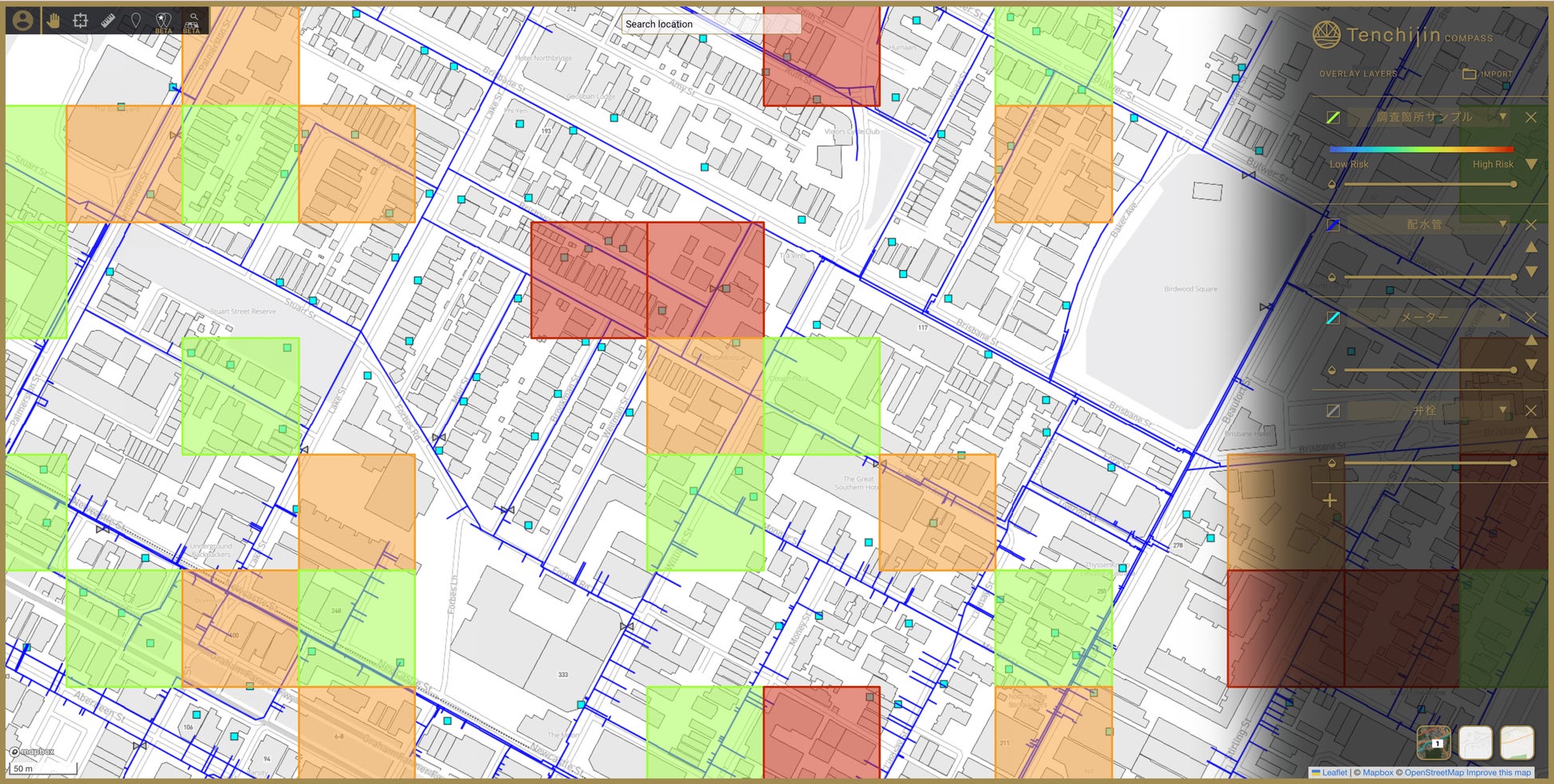 ※画像は「天地人コンパス 宇宙水道局」のサンプルとなります。色のついている場所は水道管の漏水リスクの恐れのある場所を指しています。現段階では漏水リスクの高低差を5段階に分けており、赤色は漏水リスクの最も高い場所を指しています。