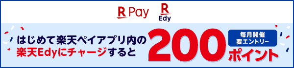 また、「楽天Edy」では、「はじめて楽天ペイアプリ内の楽天Edyにチャージすると楽天ポイント200ポイントプレゼント」キャンペーンを開催しています。期間中、キャンペーンページからエントリーし、対象のチャージ方法で初めて合計1,000円以上チャージされた方に、200ポイントを進呈します。「楽天キャッシュ/ポイントチャージ」機能でのチャージもキャンペーン対象となります。