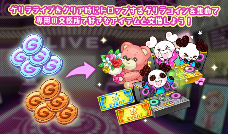 ゲリラライブをクリアするとイベントptや専用アイテム「ドリームゲリラコイン」を獲得できます。「ドリームゲリラコイン」は『ドリームゲリラコイン交換所』で好きなアイテムと交換できるので、どんどんゲリラライブに参加しましょう!