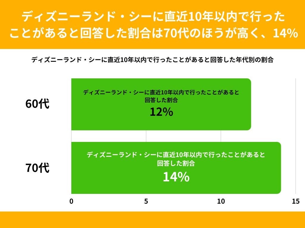 ディズニーランド・シーに直近10年以内で行ったことがあると回答した割合を年代別でみてみますと、70代が14%、60代が12%という結果になりました。