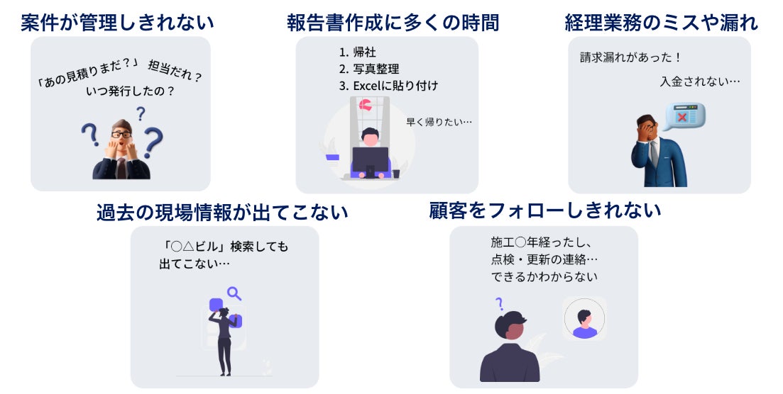 工事・メンテナンス業界には「転記作業の繰り返し」「仕事と情報の属人化」「現場情報がなく保守や更新工事に繋がらない」などの課題がどの企業にも存在しています。これらの課題の根本原因は「業務フローごとでバラバラのツールを利用していること」だと考えています。