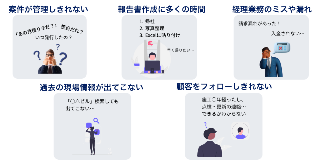 工事・メンテナンス業界には「転記作業の繰り返し」「仕事と情報の属人化」「現場情報がなく保守や更新工事に繋がらない」などの課題がどの企業にも存在しています。これらの課題の根本原因は「業務フローごとでバラバラのツールを利用していること」だと考えています。