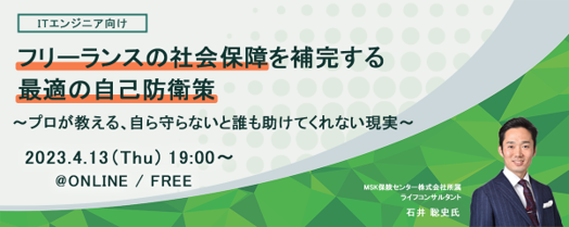 本セミナーでは、 MSK保険センターの石井聡史氏をお迎えし、会社員とフリーランスの社会保障の違いや、具体的な対策についてお話します。