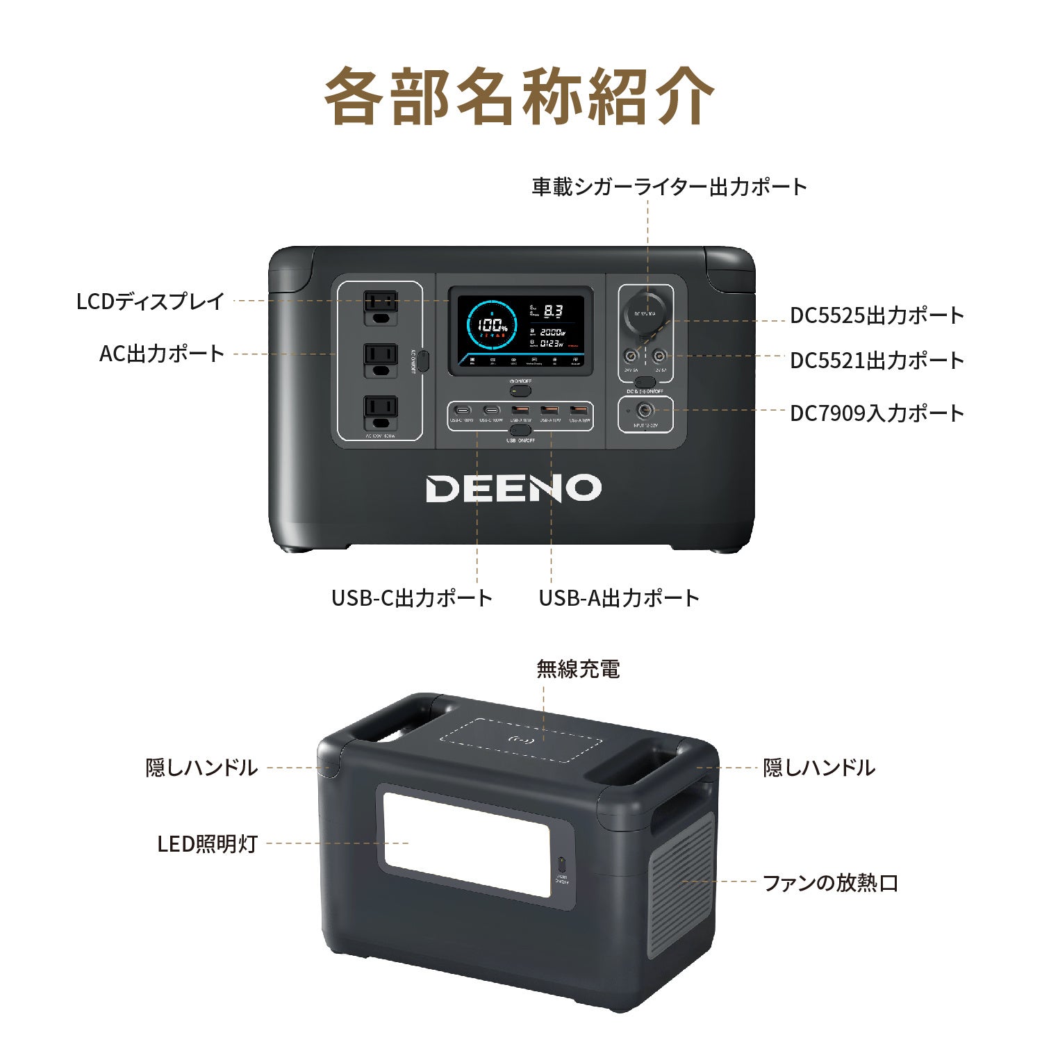 DEENO 自社開発の Intelligent BMSインテリジェントバッテリーマネージメントシステムが、過充電・過電流・過放電と共に温度や短絡を監視。安全なポータブル電源の使用をサポートいたします。