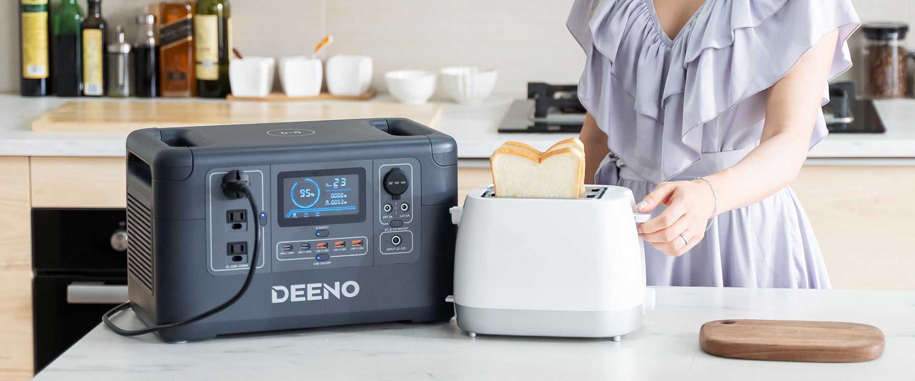 キャンプや⾞中泊のようなアウトドアでの使⽤から、⾃宅での緊急電源としてや、様々な場所でも利用しやすい、ちょうどいいポータブル電源が DEENO X1500 です。