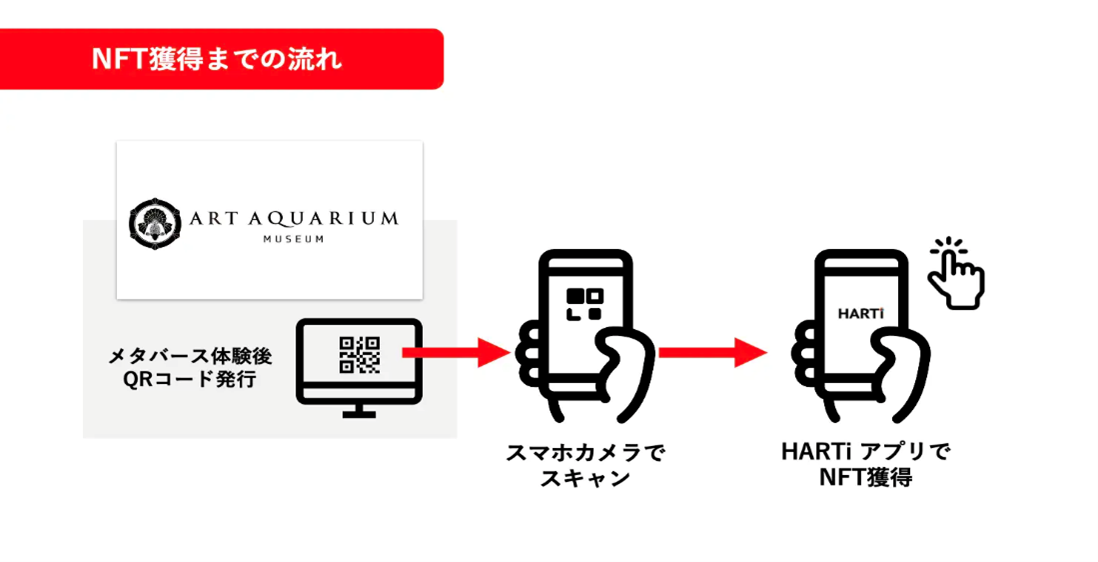 ・NFT保有者にはHARTiアプリ内のウォレットを通じて、特別なご案内が届き、アートアクアリウム美術館との新たな繋がりが生まれます。来館分と併せて2種類以上のNFTを獲得した場合、後日「交配」により新しい「稚魚」イラストNFTがウォレットへ自動配信されます。(配信完了時にはアプリ上で通知が届きます)