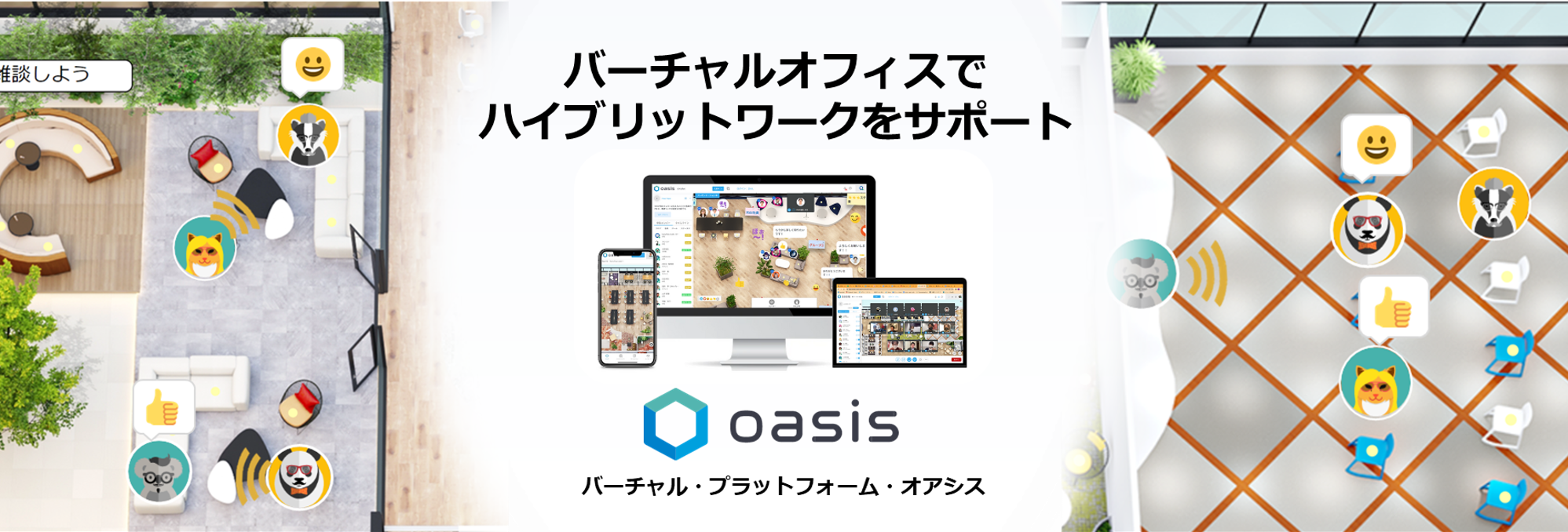 バーチャルプラットフォームOasisは、2Dのメタバース空間で利用者がアバターで移動し会話ができるプラットフォームです。他社に先駆けスマートフォンアプリでの空間利用にも対応し、いつでもどこからでもOasisを利用できます。現在 様々な企業・教育機関・自治体様でご利用いただいております。
