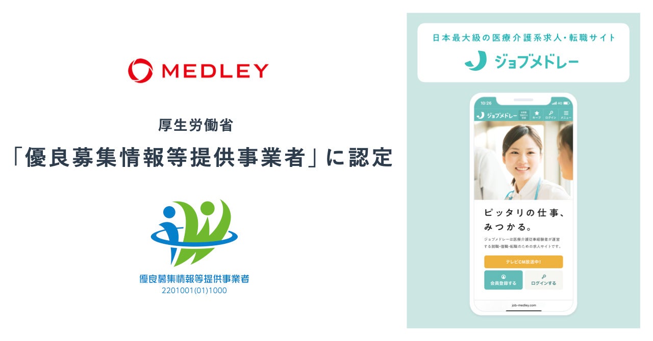 メドレーでは医療福祉の大きな課題である人材不足解消を目的に、2009年から医療介護の求人サイト「ジョブメドレー」を運営してまいりました。現在、登録求職者数は150万人を超え、約30万の事業所に利用されるサービスとなっています。今回、「ジョブメドレー」の運営実績を評価され、初回の優良募集情報等提供事業者として認定されました。