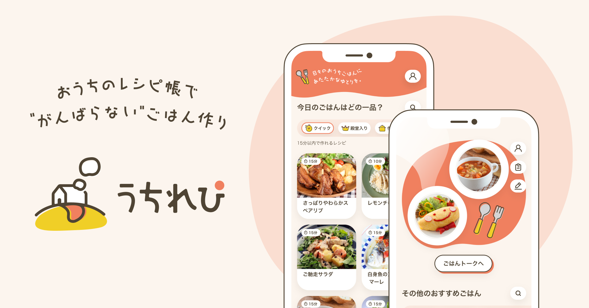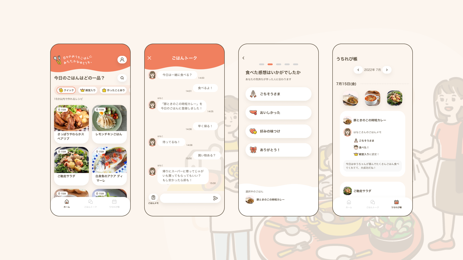 「うちれぴ」のレシピで作った料理を食べた後の感謝や感想は、家族だけのチャット機能「ごはんトーク」におまかせ。どんな食事をしたのかの記録はもちろんのこと、「おいしかった!」「今度はあれがたべたい!」といった食事にまつわる家族のコミュニケーションをアプリが自然に生み出します。
