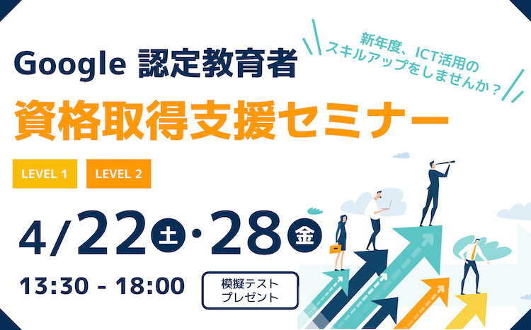 「Google のツールについて基本的なスキルを身に付けたい」「今年度は授業や校務でICTを存分に活用したい」「スキルアップして仕事に活かしたい」とお考えの皆様が自信を持って活用を進められるように、資格取得に挑戦してみませんか?新年度の忙しさが一段落する4月後半、皆様のご参加をお待ちしております。