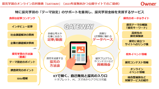 また、株式会社オーナーでは、探究百科「GATEWAY」を「総合的な探究の時間」の教材として利用いただける高等学校様を募集しております。先生方の登録のみで利用でき、教材の利用料も無料でご導入をいただけます。