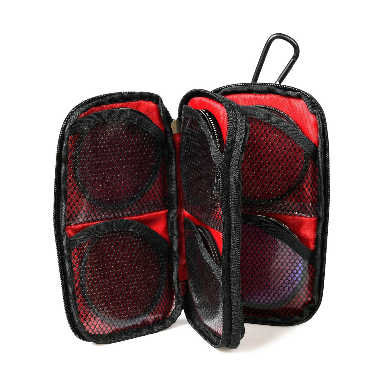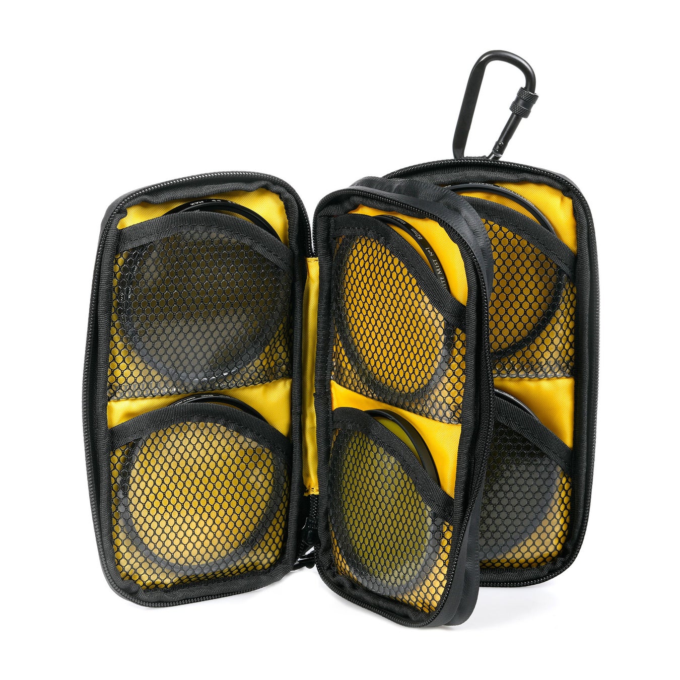 カラビナ、ベルトループ、三脚取り付けフラップを装備し82mmまでのフィルターを8枚収納することが可能。