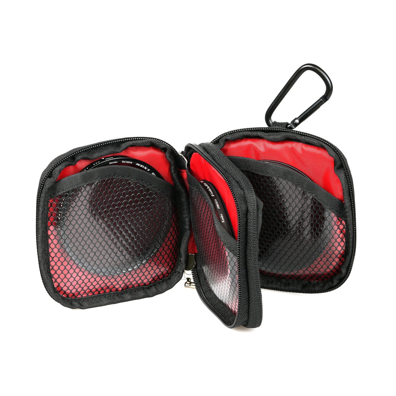 カラビナ、ベルトループ、三脚取り付けフラップを装備し82mmまでのフィルターを4枚収納することが可能。