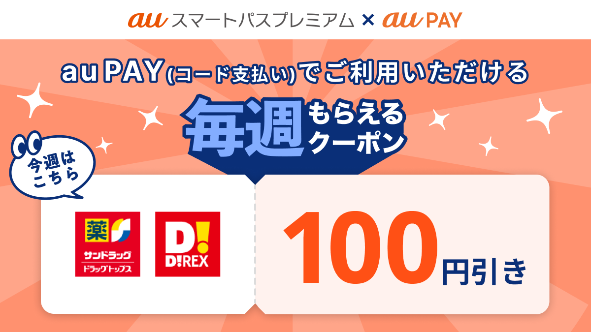 - 概要:全国のサンドラッグ、ダイレックスにおいて、au PAYで101円以上のお買い物に使える100円割引クーポンをプレゼントします。