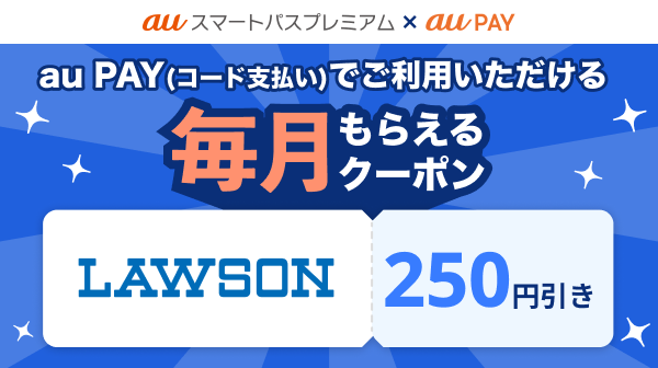 12月1日から、全国のローソン、ナチュラルローソン、ローソンストア100において、au PAYで251円以上のお買い物に使える250円割引クーポンを毎月1日配布中。