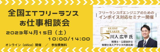 また、今回のお仕事相談会では、インボイス制度に関するセミナーも同時開催致します。今年の10月より開始されるインボイス制度は、ITフリーランスエンジニアの方にとって理解が必要な領域、基礎的な情報はもちろん、対応する・しないのそれぞれのメリット・デメリット、登録申請の手続き方法など、丁寧に解説致します。