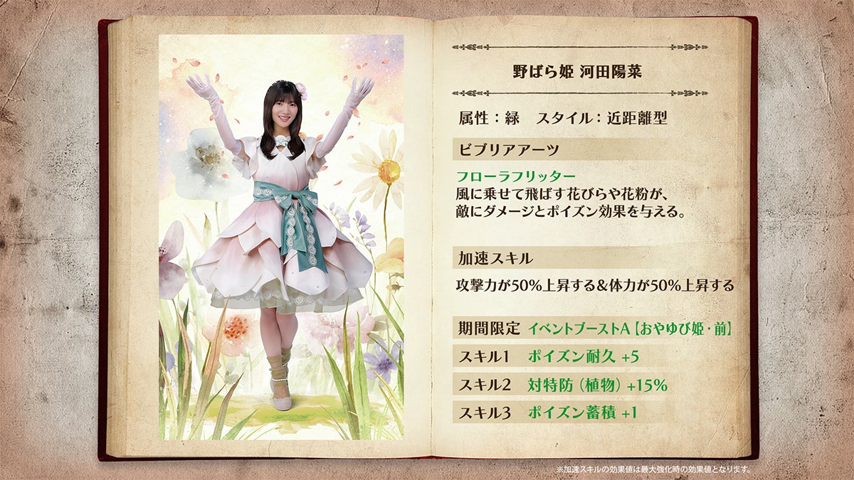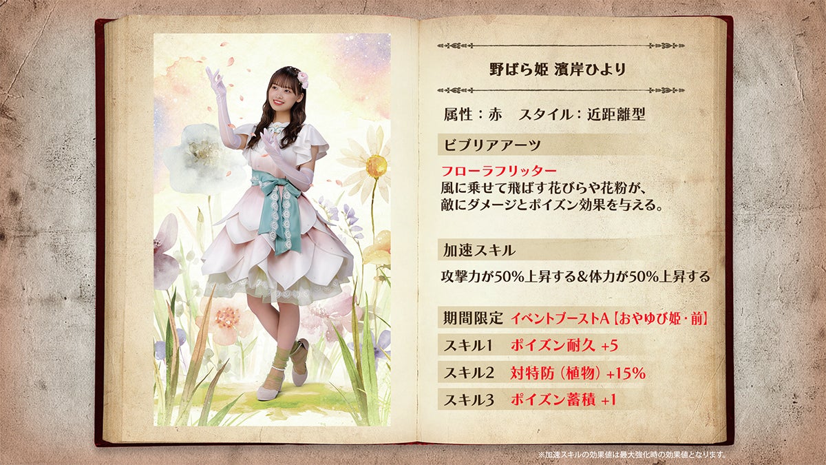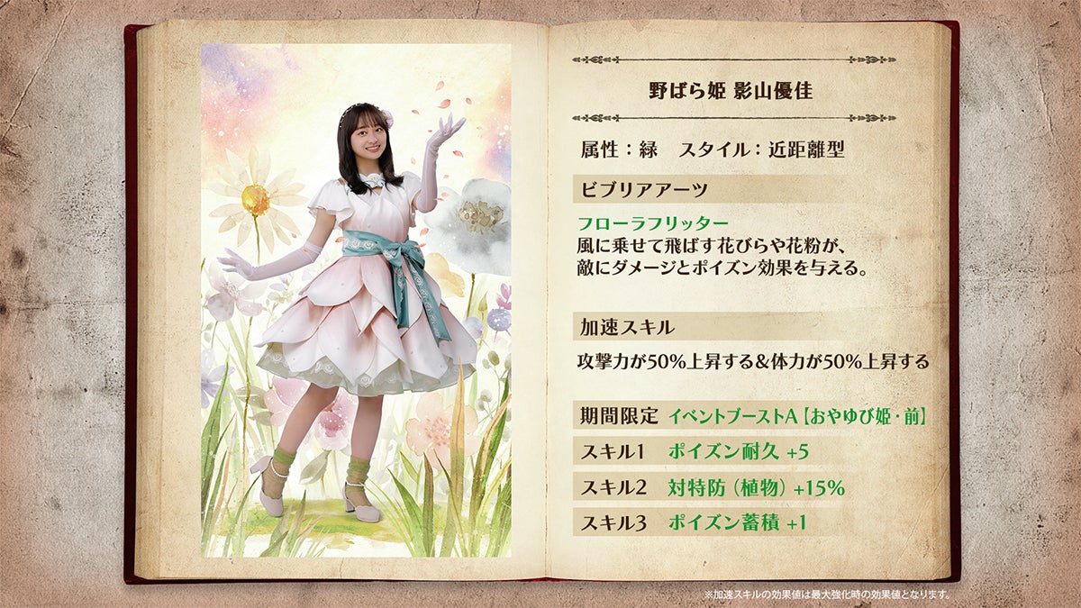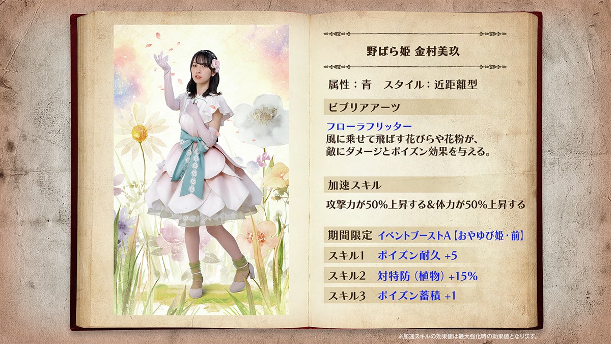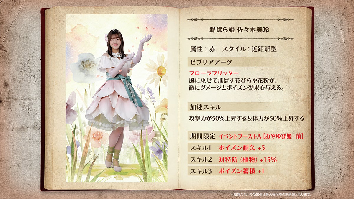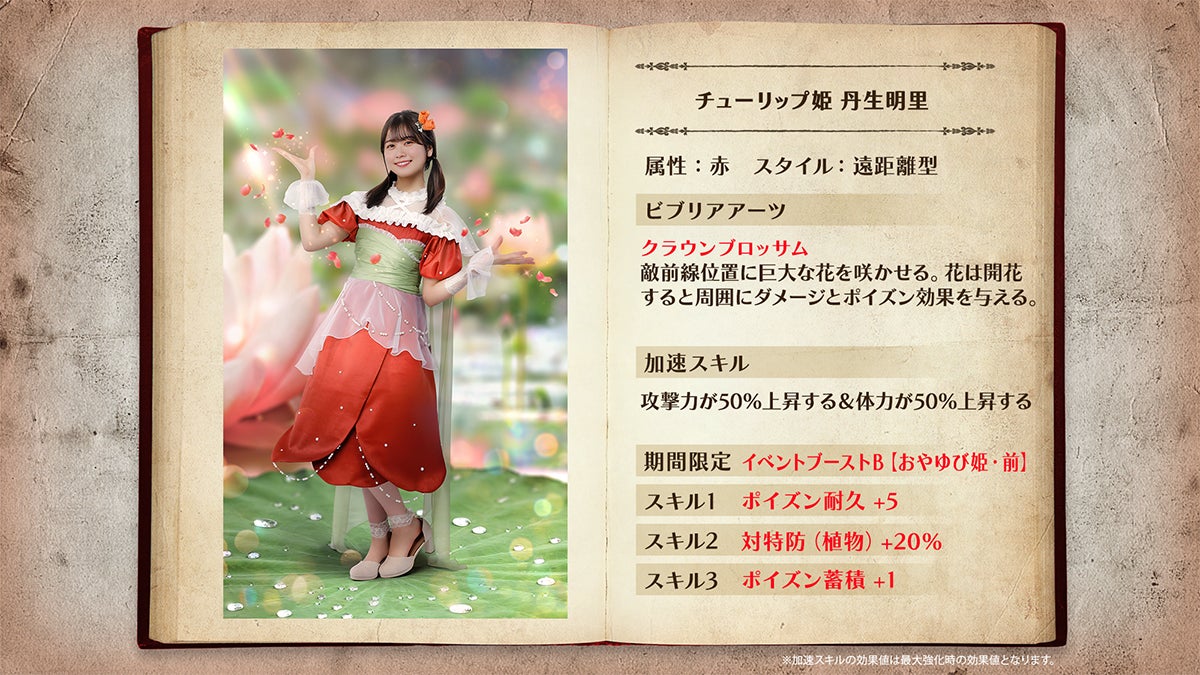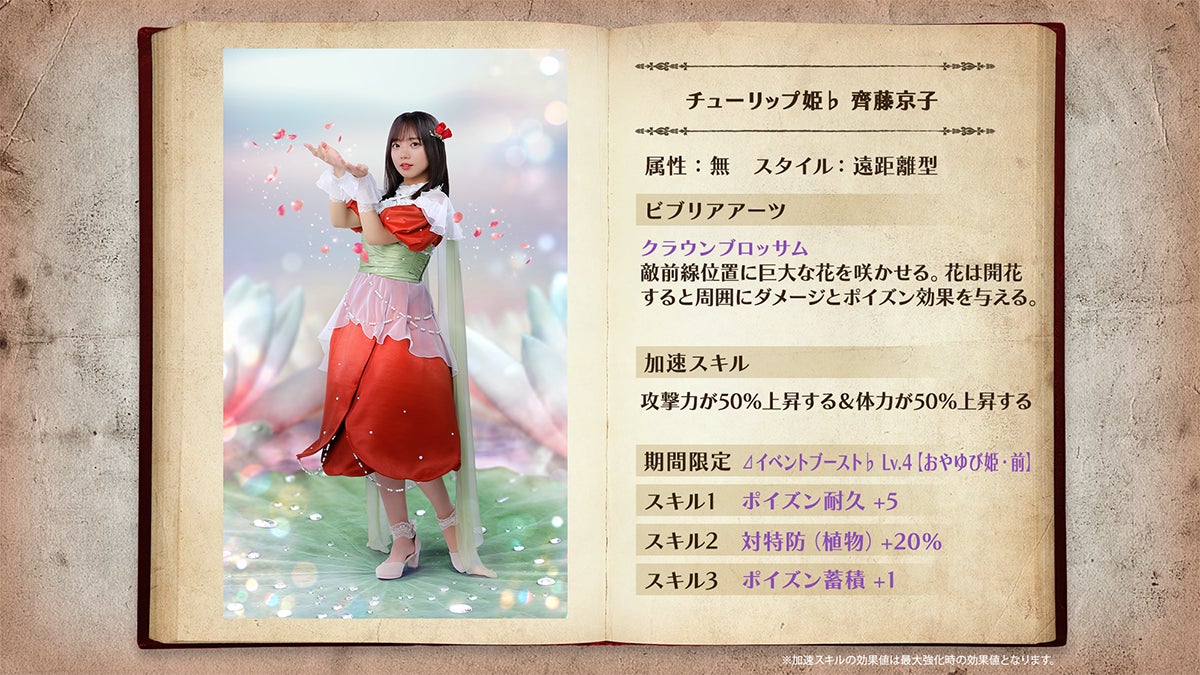 「★4 チューリップ姫♭ 齊藤京子」はパーティ内の今回のイベントでリリースされる「チューリップ姫」と「野ばら姫」ユニットを強化する効果持ち!