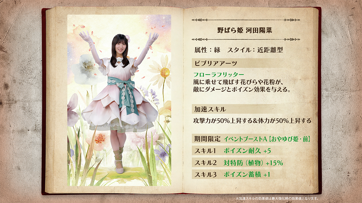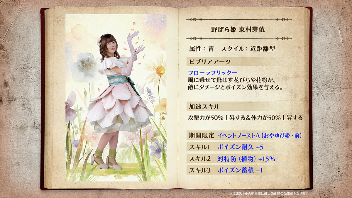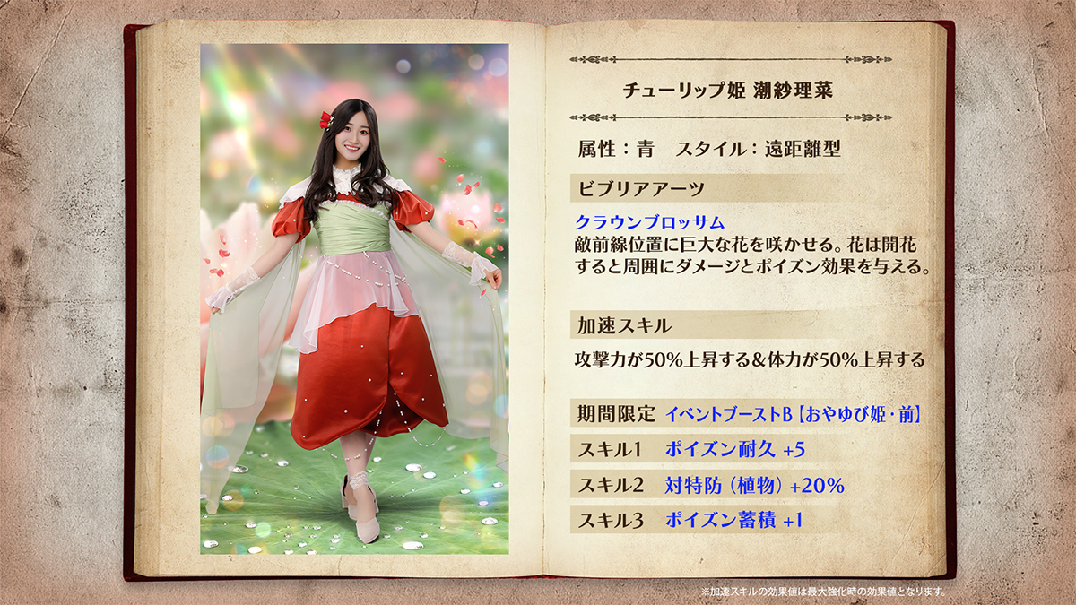 「★4 チューリップ姫♭ 齊藤京子」はパーティ内の今回のイベントでリリースされる「チューリップ姫」と「野ばら姫」ユニットを強化する効果持ち!