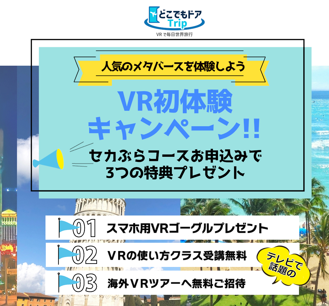 「どこでもドア Trip」の「セカぶら」コースは、世界中の観光地や人気スポット、世界遺産などを好きな時間に好きなだけ楽しめるサブスクリプション型のVR旅行体験サービスです。