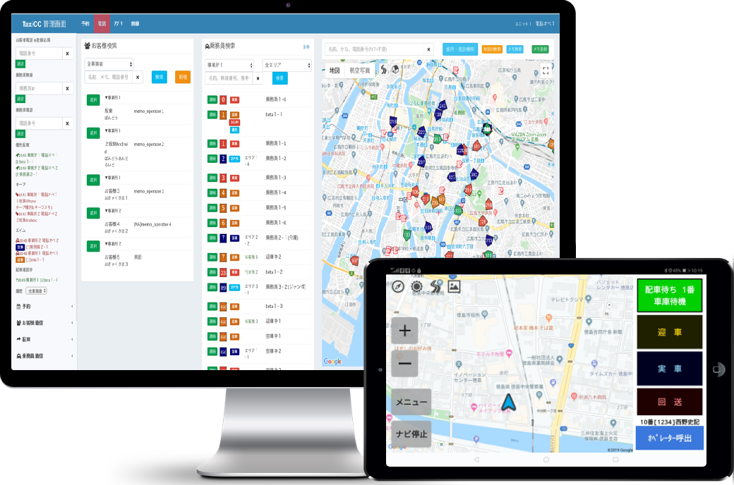 が特色の、配車オペレーター用画面とドライバー用車載タブレットをセットにした配車システムです。2015年の創業以来毎年約200%ペースで導入車両数が拡大し、日本初となる「電話経由での事前確定運賃サービス」や「配車室をリモートワーク対応できる機能」「乗合/デマンドサービスと通常のタクシーを1システムで同時に運行管理する機能」なども提供しております。