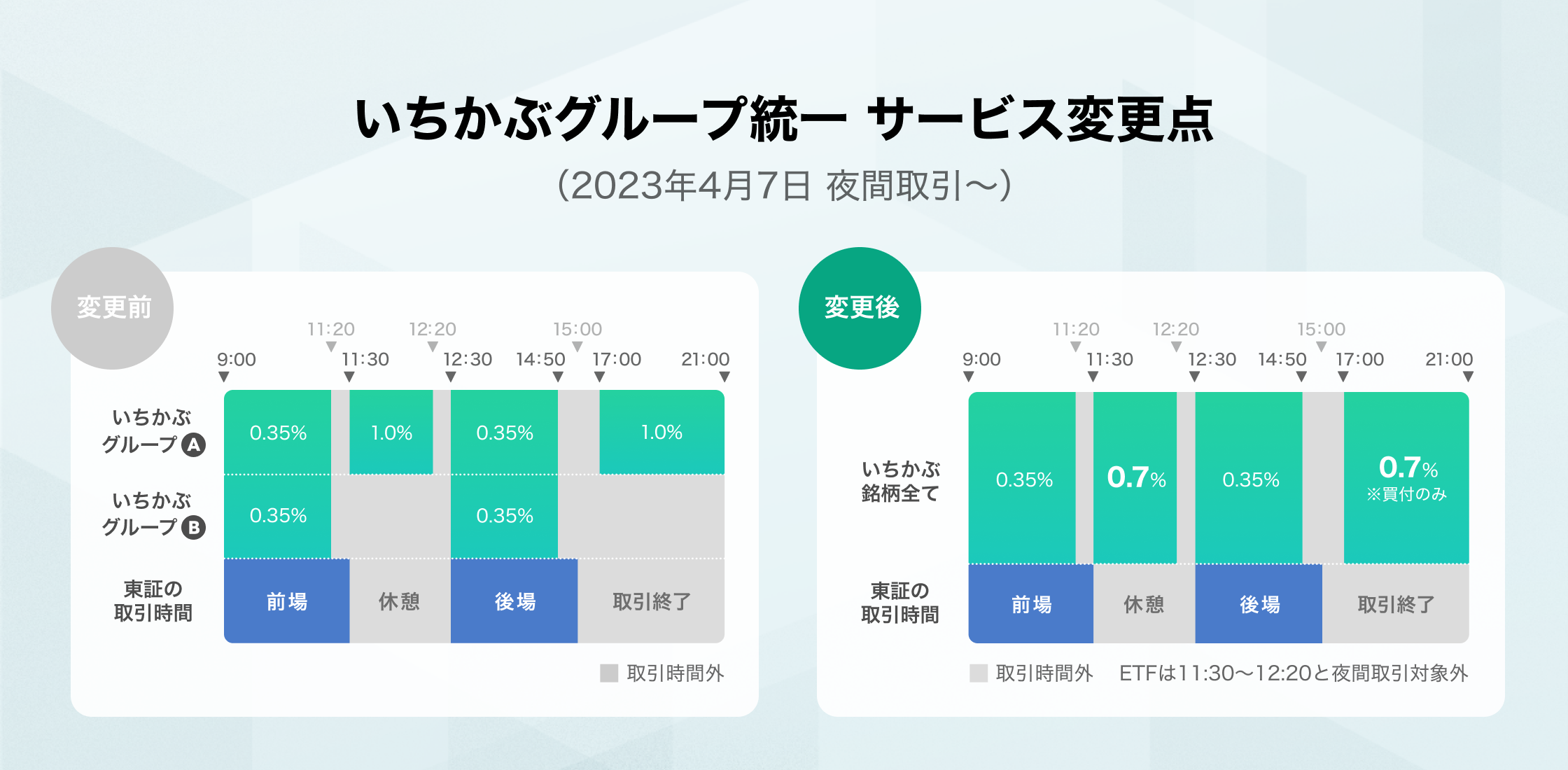 より取引しやすい環境を提供することで、投資をもっと身近に、もっと手軽に感じてもらうため、11:30~12:20/夜間の取引コストを1%から0.7%に引き下げました。