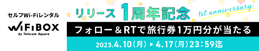WiFiBOXはおかげさまで、4月1日にサービス開始1周年を迎えました。この度、日頃の感謝の気持ちを込めて「WiFiBOXリリース1周年記念キャンペーン第一弾」として、4月10日~17日まで、WiFiBOX公式Twitterフォロー&リツイートキャンペーンを実施いたします。当選者には旅行券10,000円分をプレゼント!ぜひ皆さまからのご応募をお待ちしております。