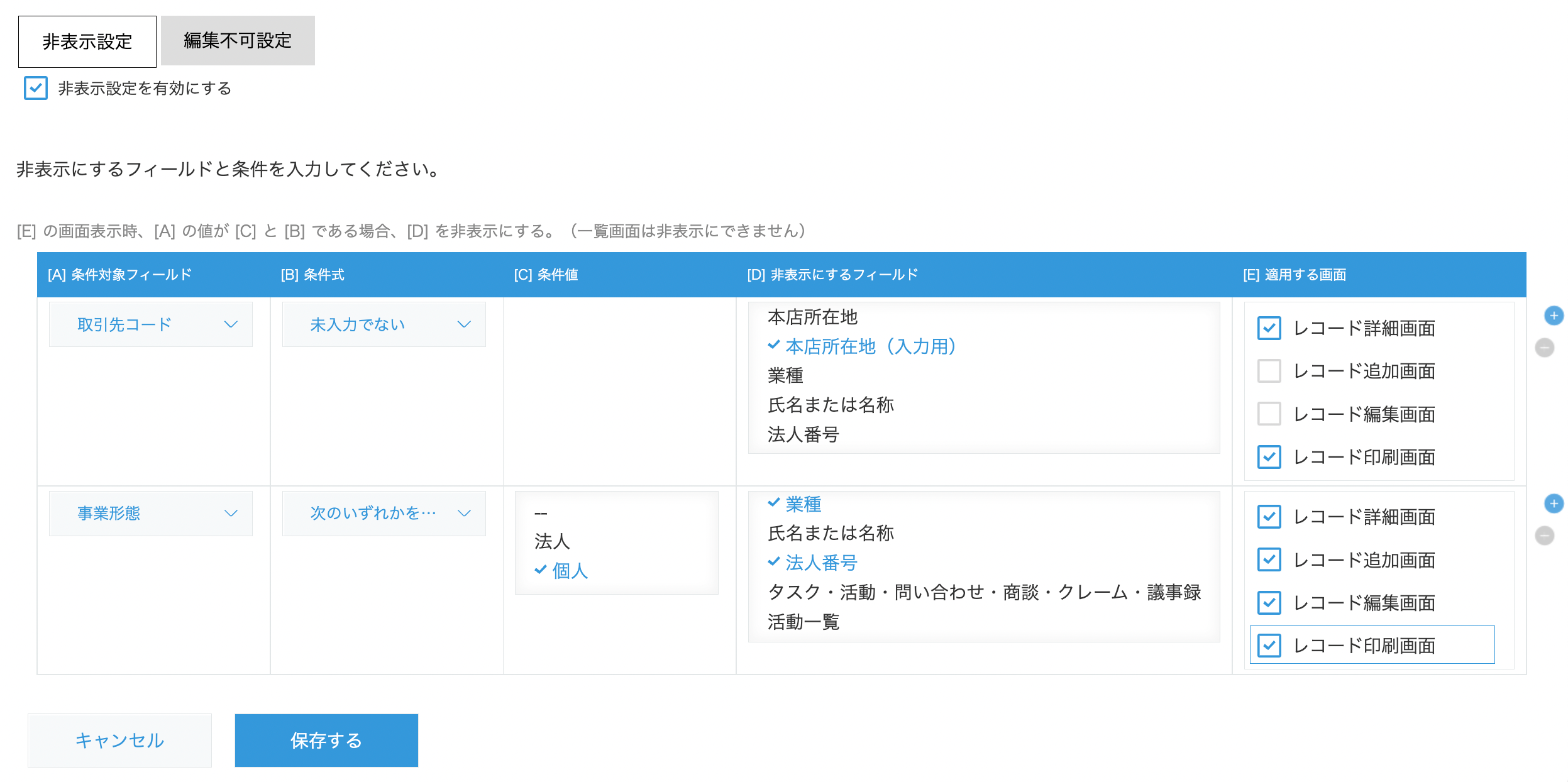 条件に応じてフィールドの表示・非表示や活性・非活性を切り替えることができるプラグインです。独自機能として、「一覧画面」「詳細画面」「追加画面」「編集画面」「印刷画面」それぞれのフィールド制御を用途に合わせて自由にカスタマイズできる機能も備わっています。これにより、ユーザーは自分たちのビジネスニーズに最適な画面をカスタマイズすることができます。