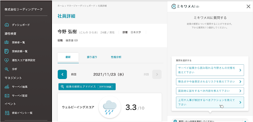 -社員のメンタル状態を可視化し、性格をもとにアドバイスをすることでウェルビーイングを実現「ミキワメ ウェルビーイング」https://mikiwame.com/well-being.html?data=pr