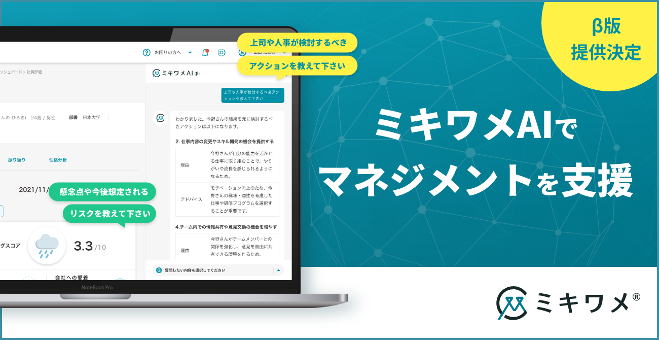 ミキワメAIを搭載した機能の第一弾として、「ミキワメ ウェルビーイング」において、性格検査とパルスサーベイの結果をもとに回答者の心理状態を解析し、上司や人事が取るべきアクションを具体的にアドバイスする機能をリリースします。従来は結果の解釈に知識が必要でしたが、ミキワメAIが結果を解釈してくれるため、より活用がしやすくなります。