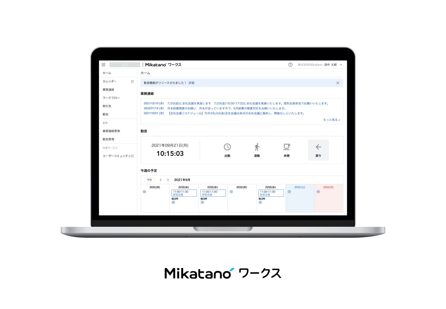 『Mikatano ワークス』は、金融機関を通じて、金融機関の顧客に当社が提供する、DXを支援するためのサービスです。社内連絡、ワークフロー、勤怠管理などのグループウェアをはじめとした日常業務に活用できるデジタルサービスが、簡単かつ直感的なUI/UXで搭載されています。IT担当者の不在などでDXが進んでいない企業でも簡単に安価で利用することができ、業務のデジタル化の第一歩を進めていくことができるサービスです。