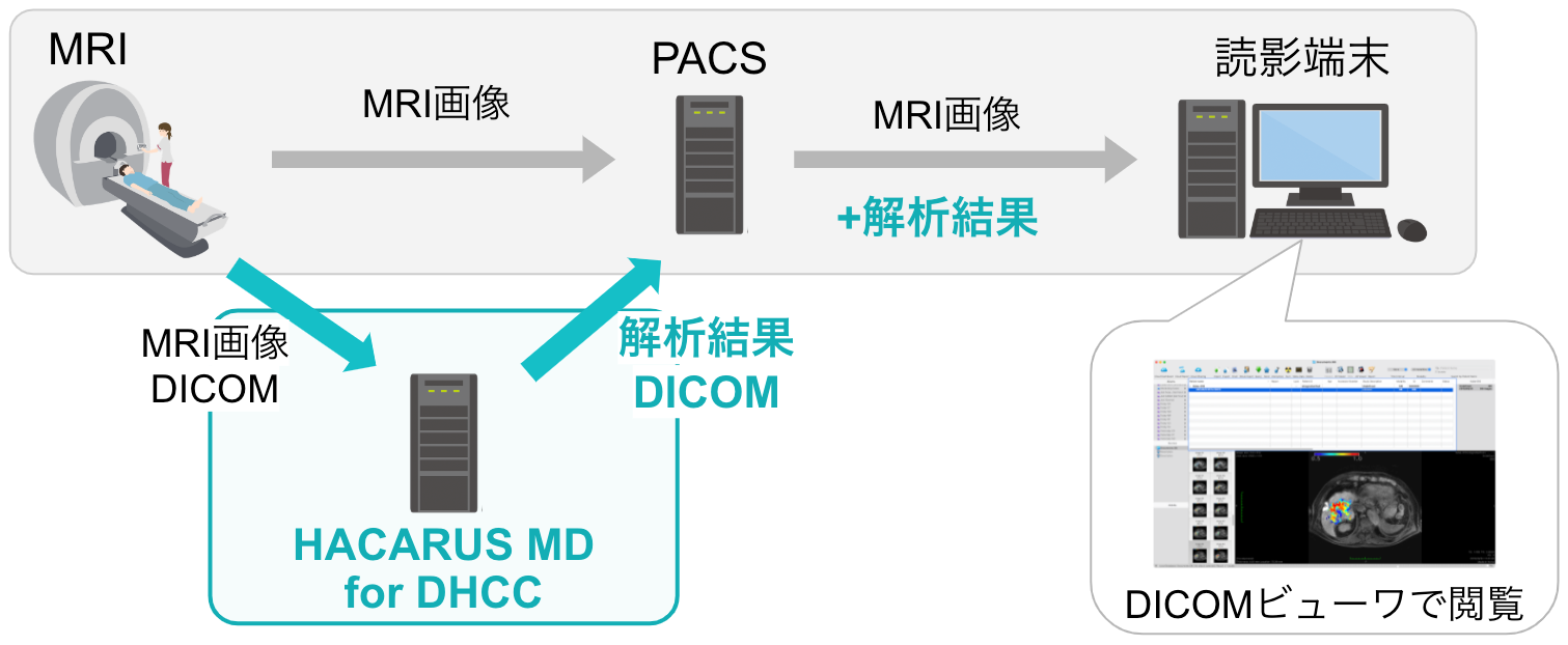 院内のPC上にインストールするオンプレミス型のソフトウェアです。院内の磁気共鳴画像診断装置(MRI)やPACSなどと連携して動作し、解析結果は通常の読影に使用するDICOM ビューワなどで確認することを前提にしています。MRIで撮影された腹部のEOB・プリモビスト造影MRIの画像情報をコンピューターで処理し、周囲と比べ信号値の異なる領域を AI が自動で抽出します。医師の読影および診断の補助を行うことを目的としており、解析結果のみで確定診断を行うものではありません。